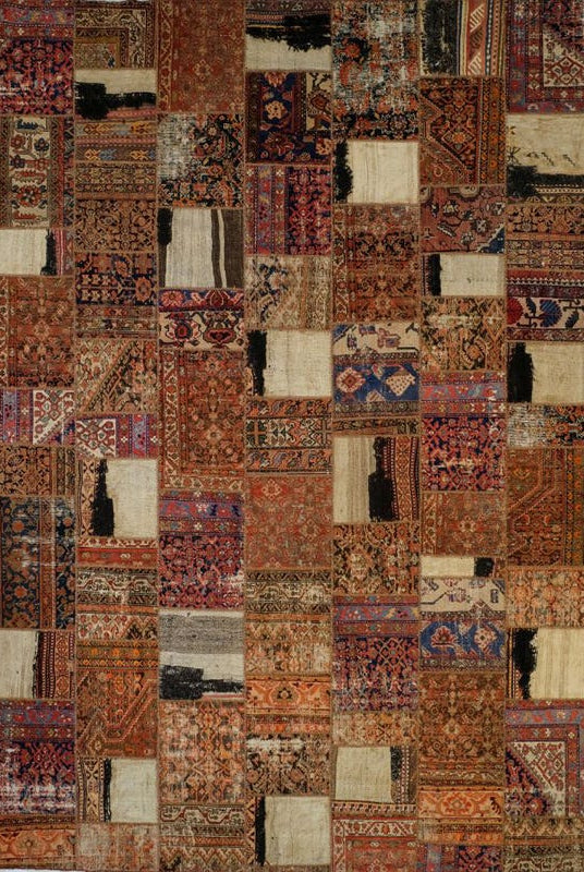 Alfombra anudada a mano por artesanos, reciclada y modernizada a través de tratamientos de teñido y carving, logrando un diseño clásico con colores y texturas modernas.