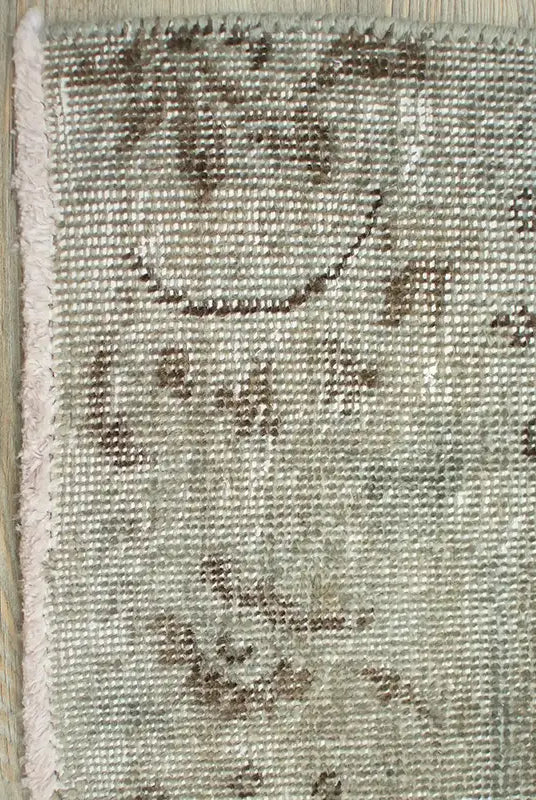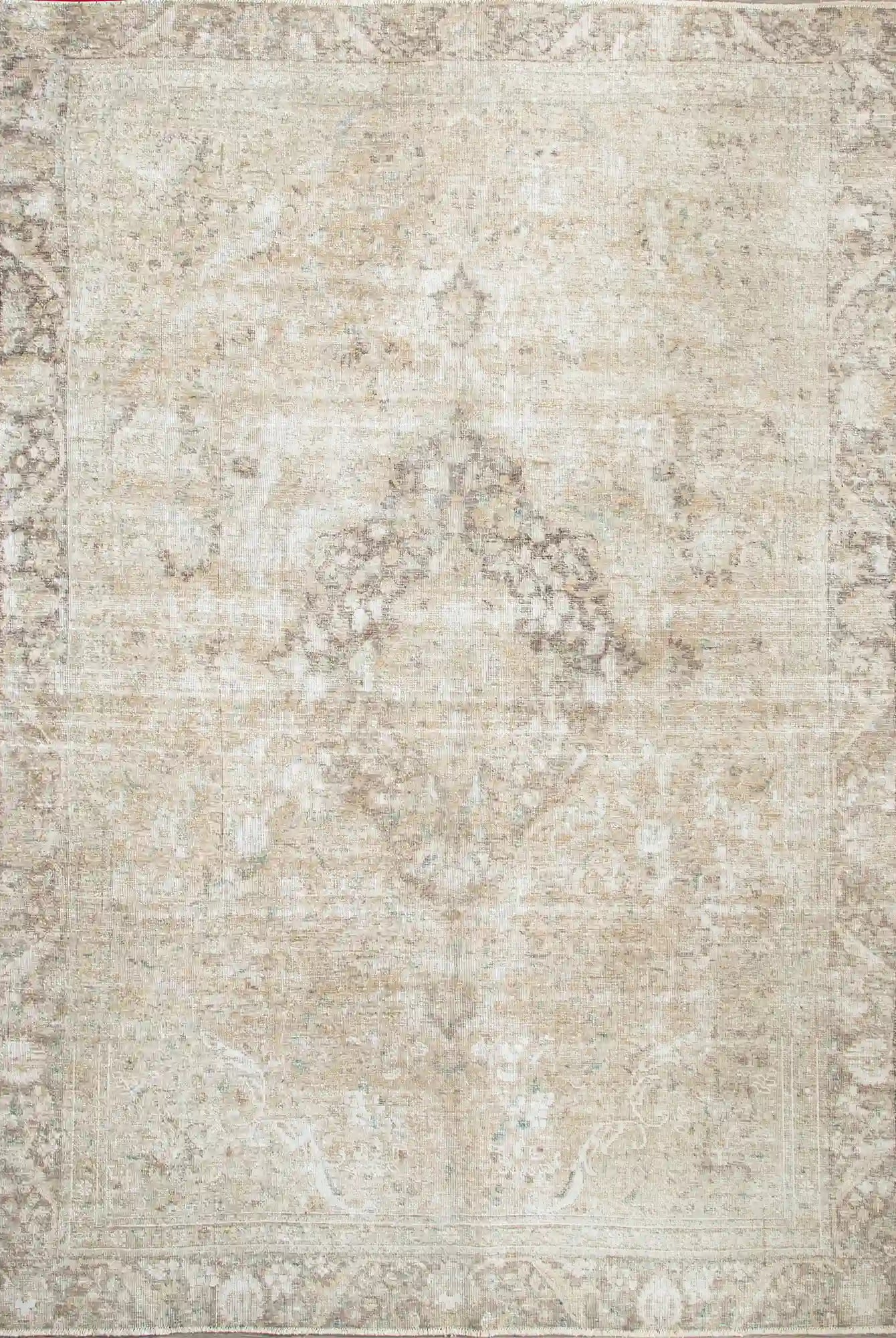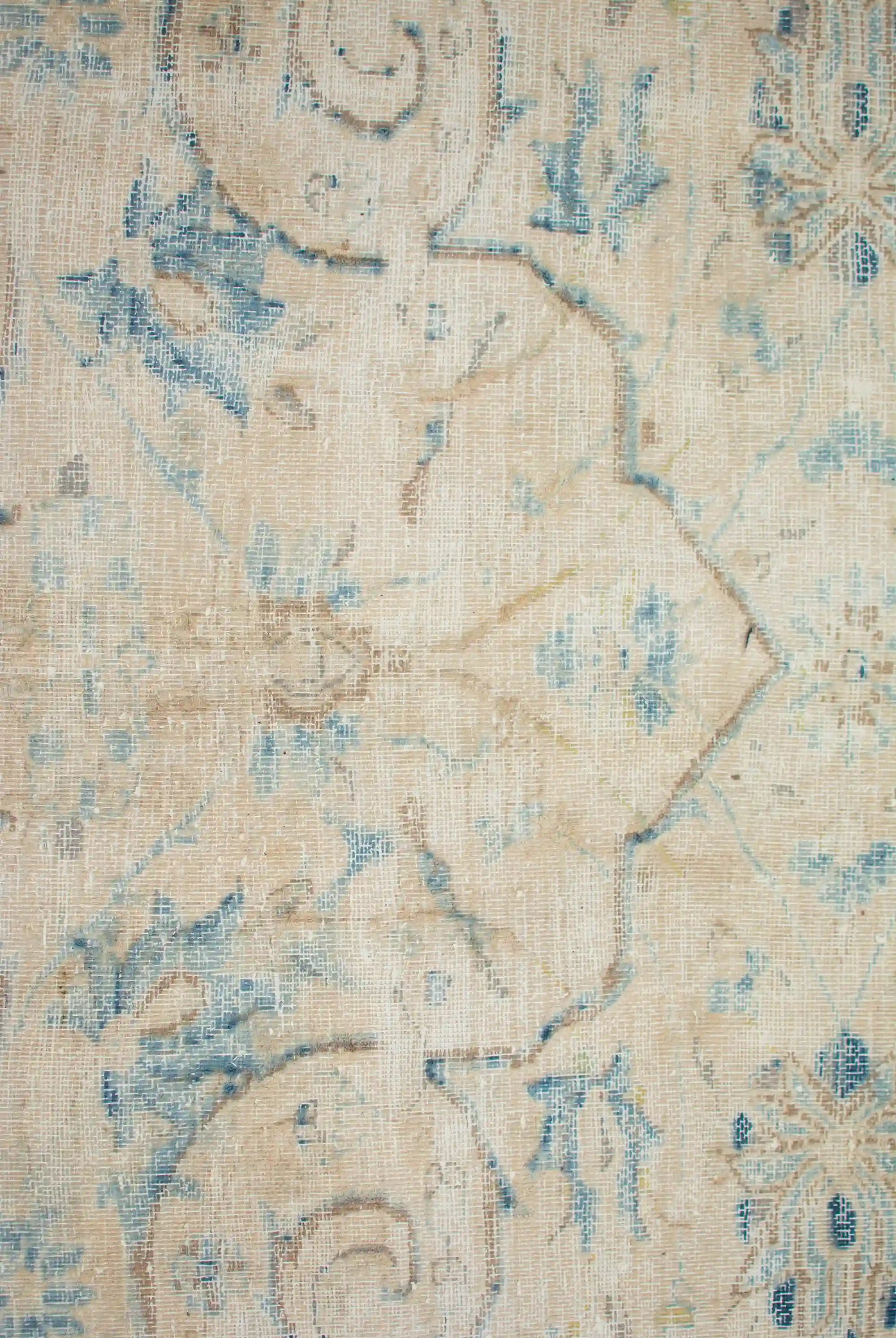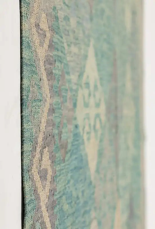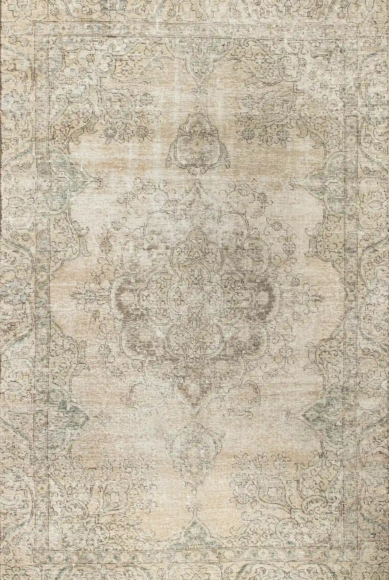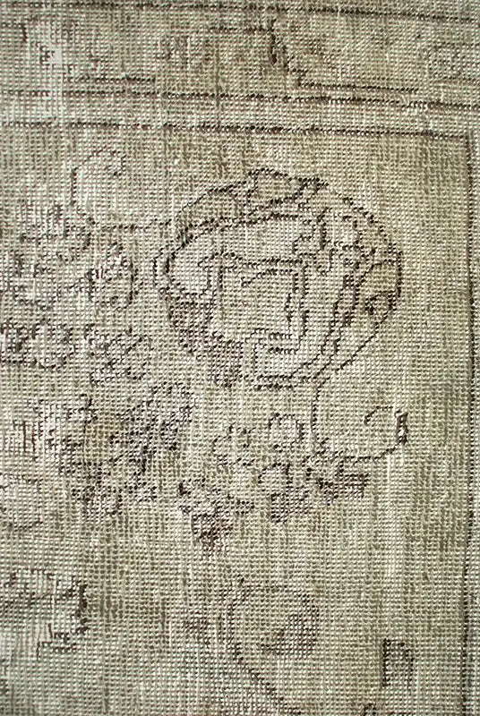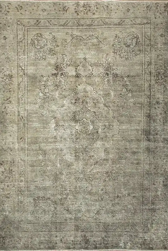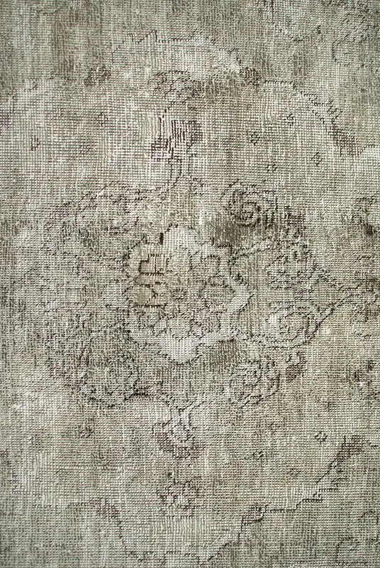 Alfombra anudada a mano por artesanos, reciclada y modernizada a través de tratamientos de teñido y carving, logrando un diseño clásico con colores y texturas modernas.