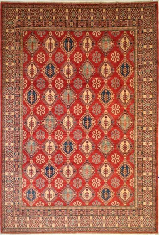 Alfombra anudada a mano por artesanos, diseños geométricos de estilo clásico y pre4dominancia de tonos azules y rojos. Se originaron en el área de Kazak (Armenia) a principios del siglo XVIII.