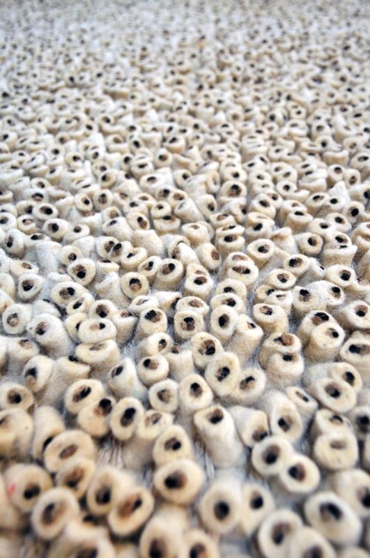 Alfombra Bazhars artesanal, confeccionada a mano por artesanos con lana natural de oveja y fieltro. Su diseño combina tubos de fieltro beige con punta café, logrando una alfombra contundente con ricas texturas y gran calidez.