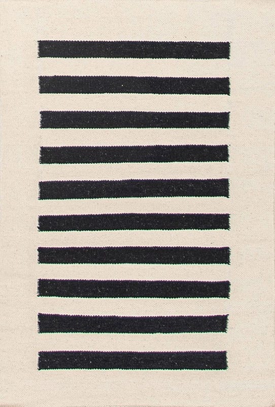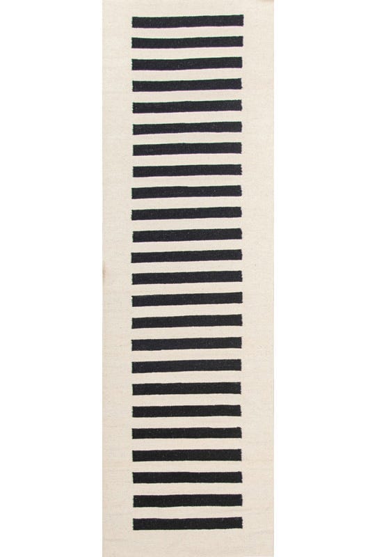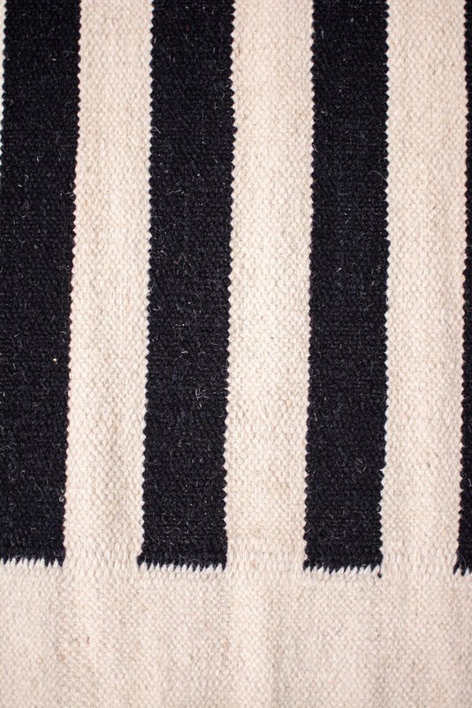 Alfombra kelim tejida a mano en India, con técnica de tejido plano. Destaca por su sencillo diseño en colores natural y negro, ideal para añadir un toque artesanal y elegante a cualquier espacio.