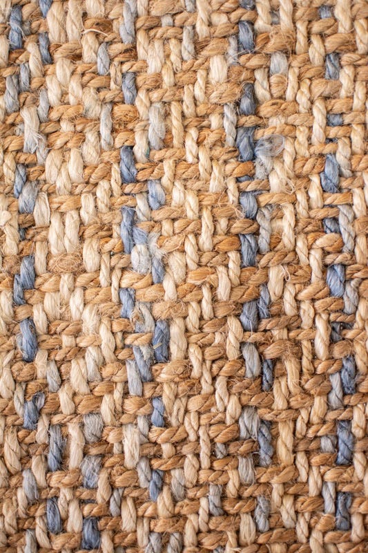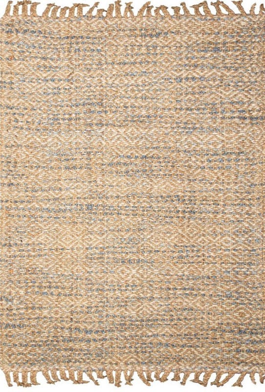 Alfombra Bazhars artesanal, tejida a mano por artesanos con finas hebras de jute y finos diseños de rombos en color crudo con sutiles toques de celeste y blanco. Excelentes terminaciones con backing anti deslizante por debajo.