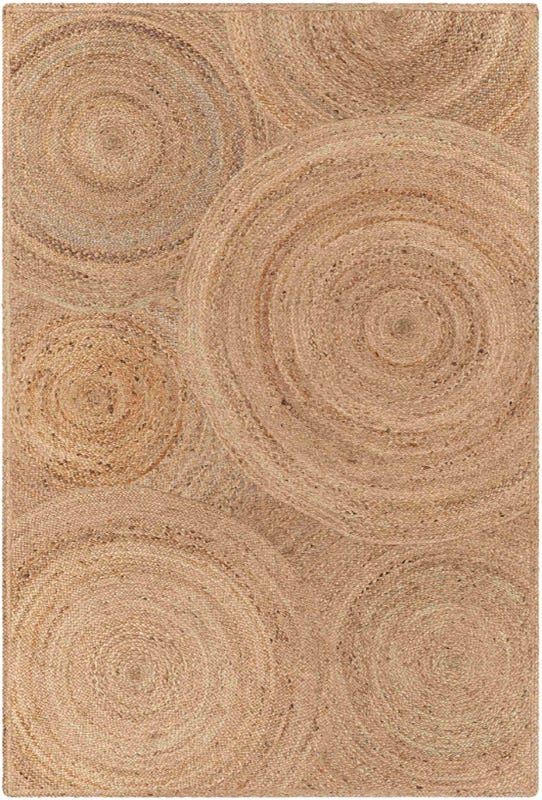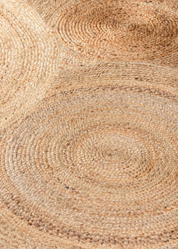 Alfombra Bazhars artesanal, tejida a mano por artesanos con finas hebras de jute y un fino tramado con un diseño en base a una sucesión de círculos en distintos tamaños. Excelentes terminaciones con backing anti deslizante por debajo.