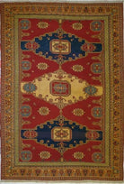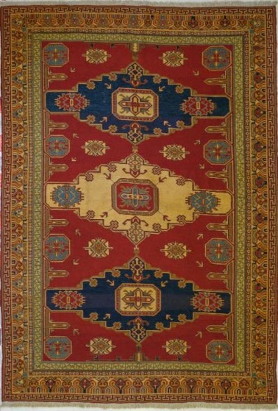 Alfombra tejida y bordada a mano en telares por artesanos, con diseños geométricos de estilo clásico y predominancia de tonos azules y rojos. Se originaron en el área de Kazak (Armenia), a principios del siglo XVIII.