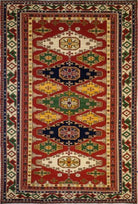 Alfombra tejida y bordada a mano en telares por artesanos, con diseños geométricos de estilo clásico y predominancia de tonos azules y rojos. Se originaron en el área de Kazak (Armenia), a principios del siglo XVIII.
