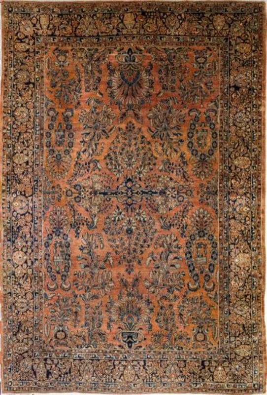 Alfombra de no menos de 80 años de antiguedad, anudada a mano por artesanos en tiempos en que la elaboración no estaba industrializada y por ende todo el proceso de hilado, teñido y anudado se hacía en forma 100% artesanal.