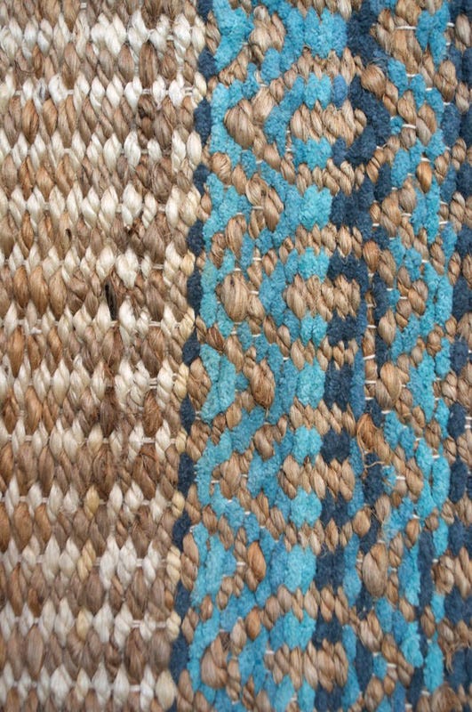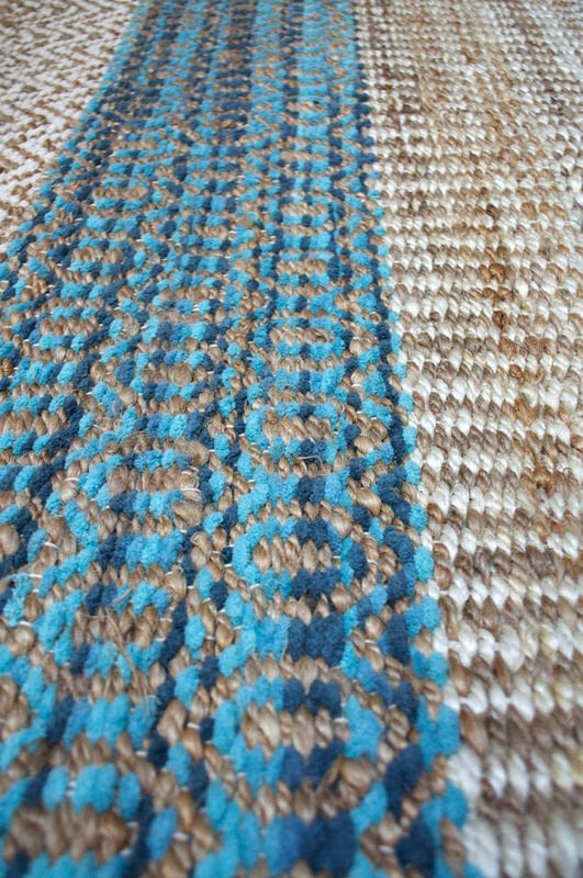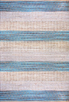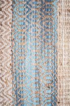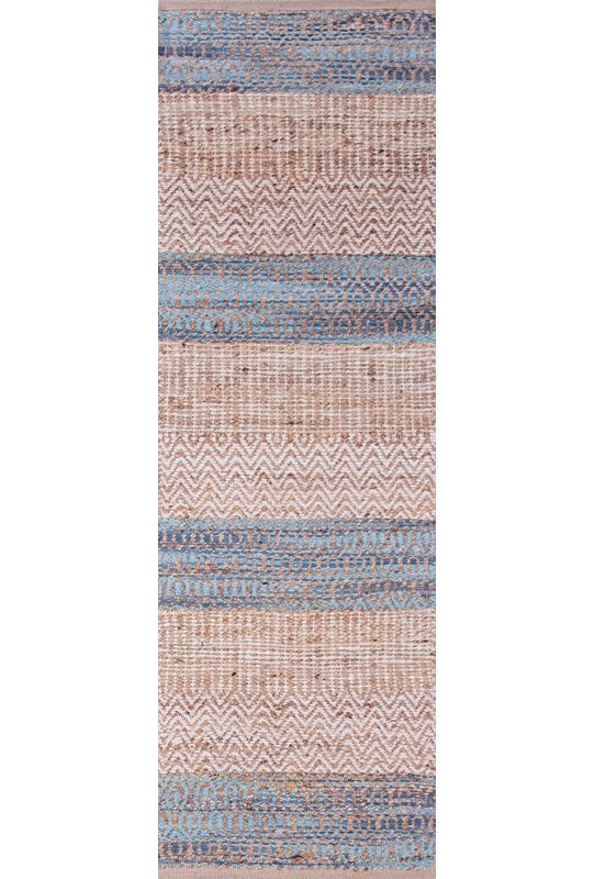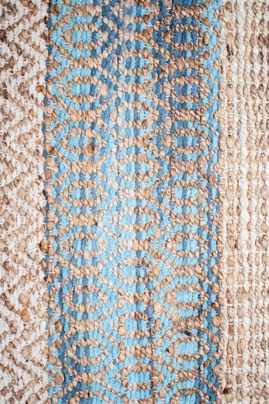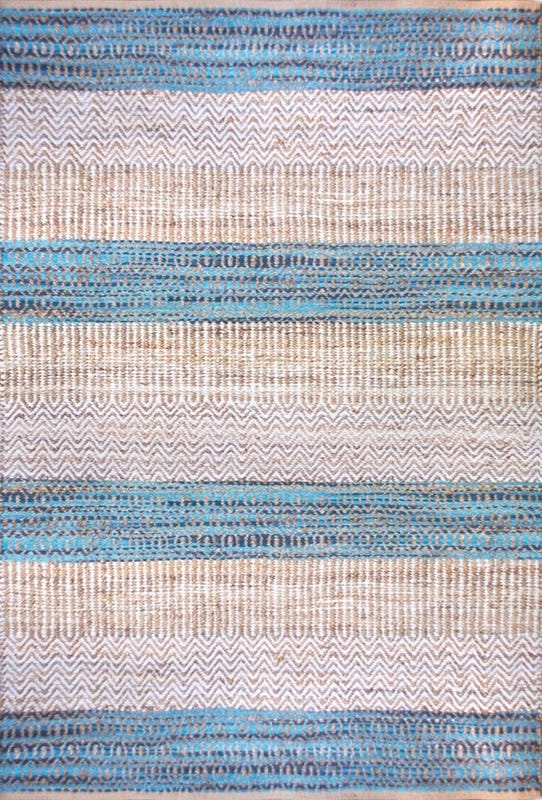 Alfombra Bazhars artesanal, tejida a mano por artesanos con finas hebras de jute y diseños intercalando franjas de color crudo y azul. Excelentes terminaciones con backing anti deslizante por debajo.