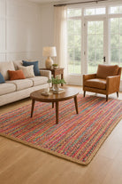 Alfombra Bazhars artesanal, tejida a mano por artesanos con finas hebras de jute natural y algodón reciclado multicolor, logrando un trama densa, muy práctica y resistente, para iluminar y agregar un acento de color a tus espacios