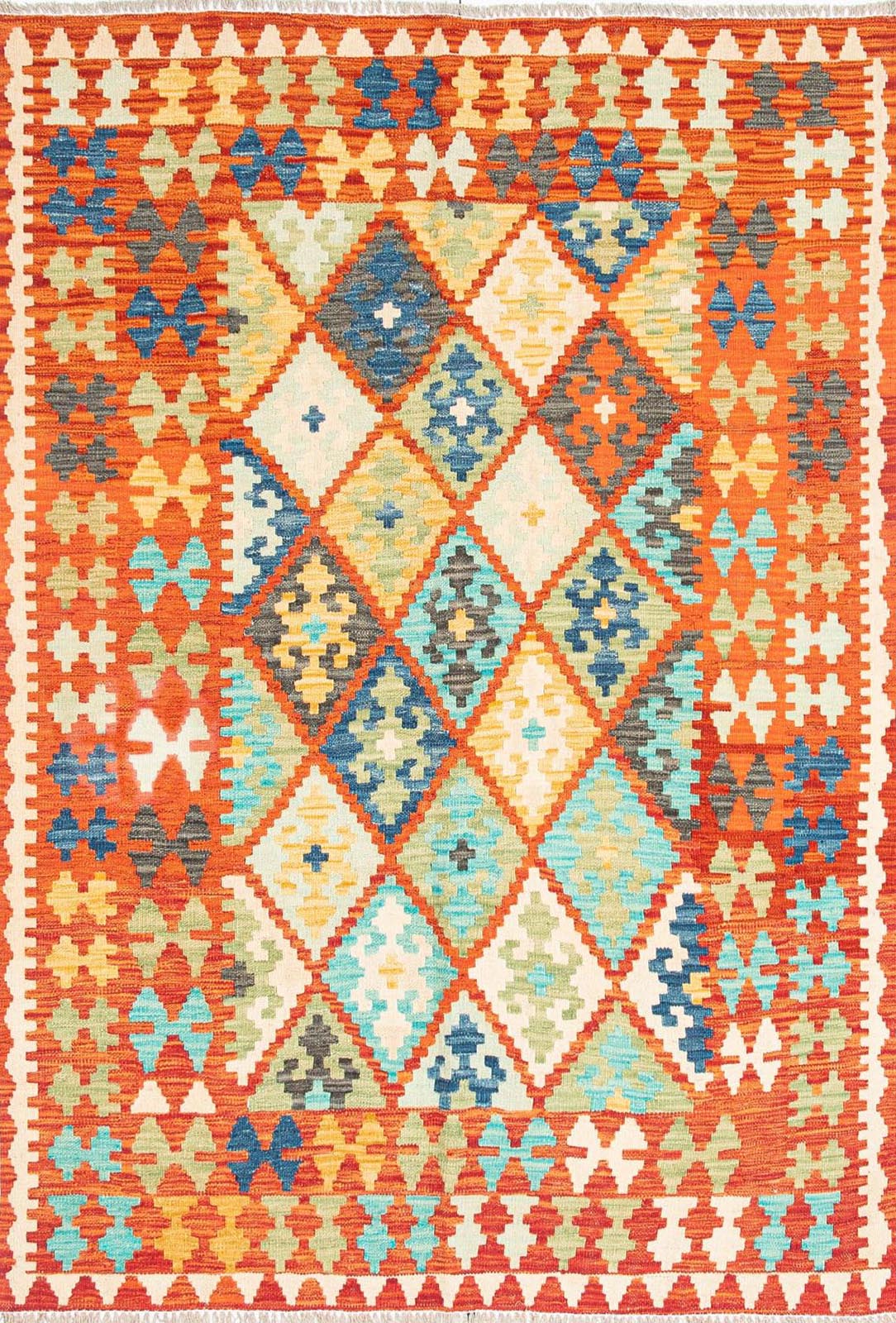 Alfombra tejida a mano en telares por artesanos afganos, con diseños étnicos y vivos colores usanda lanas hiladas artesanalmente y teñidas con tintas naturales, manteniendo una tradición transmitida de generación en generación.