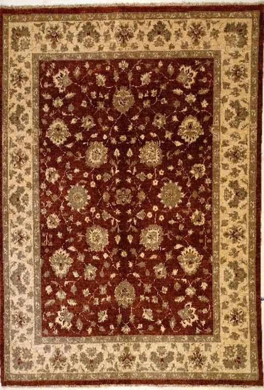 Alfombra anudada a mano por artesanos, con diseños florales, estilo clásico y predominancia de tonos beige claro, café y burdeos. El término "Ziegler" proviene de una distribuidora de alfombras anglo suiza que funcionaba en el siglo XIX