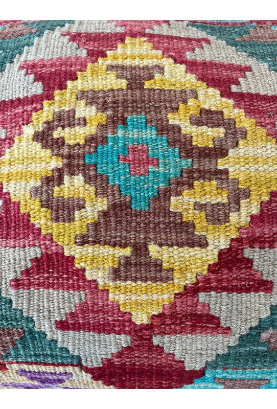 Funda de kelimes Vegi Bazhars tejida a mano en telares por artesanos afganos, con diseños étnicos y vivos colores usando lanas hiladas artesanalmente y teñidas con tintas naturales, manteniendo una tradición transmitida de generación en generación. Cada ejemplar es único e irrepetible.