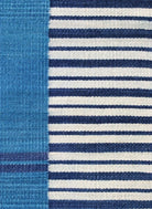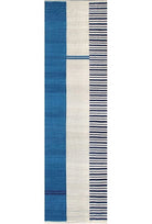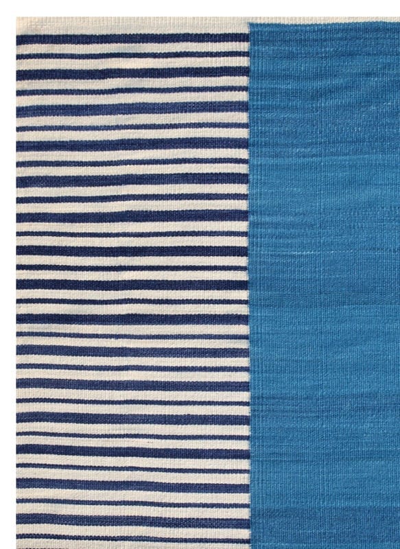 Alfombra Kelim Bazhars artesanal, confeccionada a mano por artesanos con lana natural de oveja. Sobre una base beige claro, se desarrolla un fino diseño en base a franjas en tonos azules, logrando una alfombra que realza distintos ambientes.