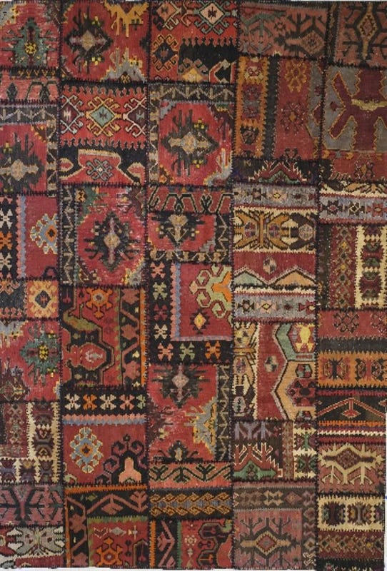 Alfombra hecha en base a una combinación de trozos de distintas alfombras anudadas a mano, combinadas y cosidas por artesanos.