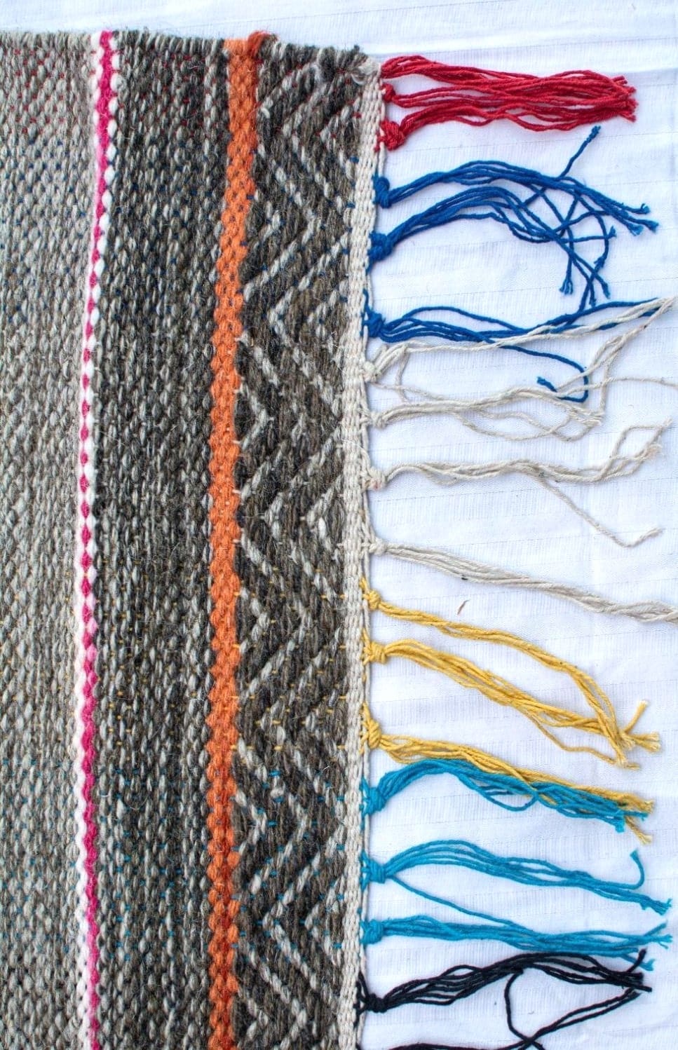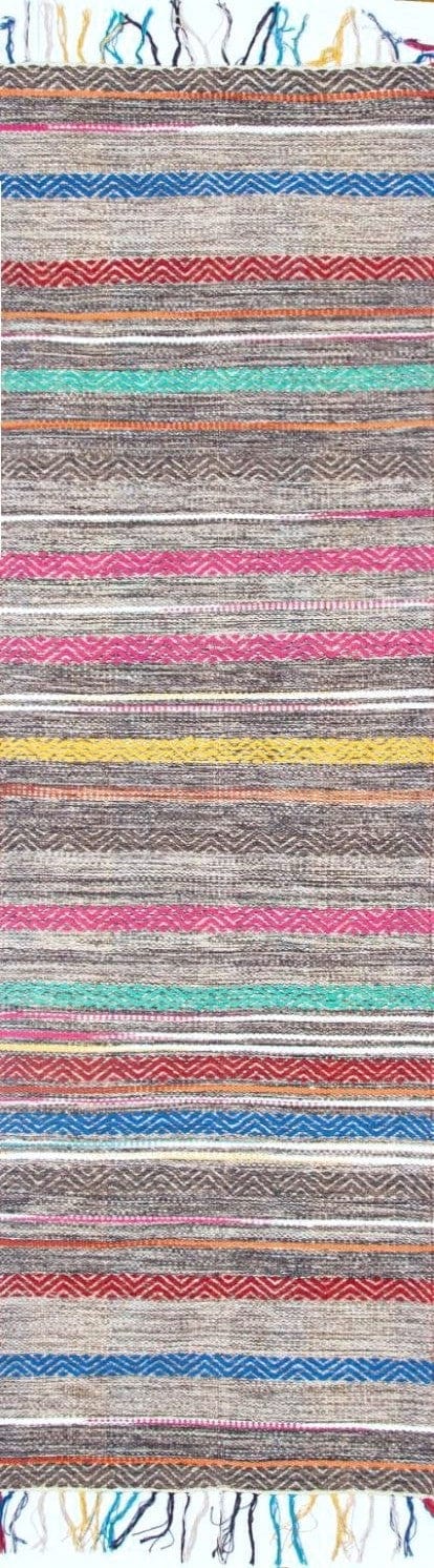 Alfombra Kelim Bazhars artesanal, confeccionada a mano por artesanos con lana natural de oveja. Sobre una base Café/Beige, tienen detalles de diseño en vivos colores, logrando una alfombra que realza los ambientes. Reversible, y para diferentes espacios.