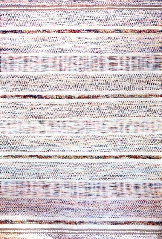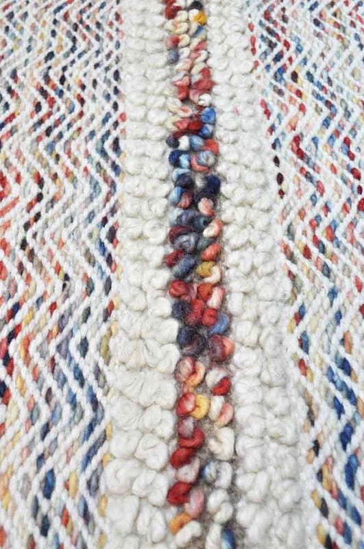 Alfombra Bazhars artesanal, confeccionada a mano por artesanos con lana natural de oveja. Su diseño combina además de variedad de colores, diferentes tramados de tejido, logrando una alfombra contundente con ricas texturas y gran calidez.