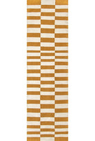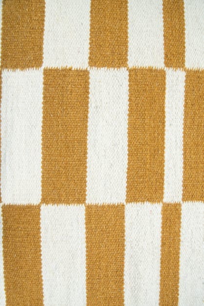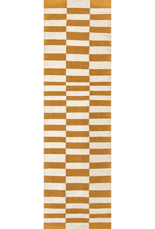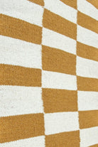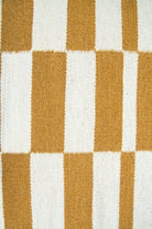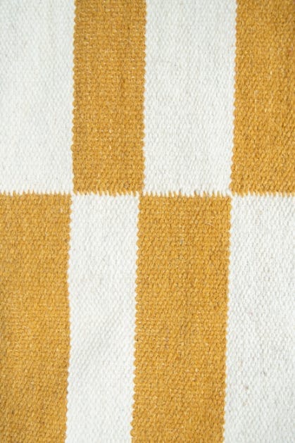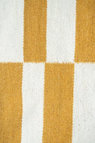 Alfombra kelim tejida a mano en India, utilizando una técnica de tejido plano. Esta pieza se distingue por su diseño sencillo en tonos natural y mostaza, ofreciendo un equilibrio perfecto entre artesanía y elegancia con un acento de color.