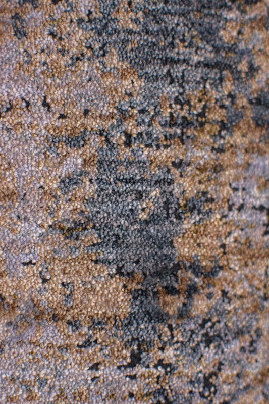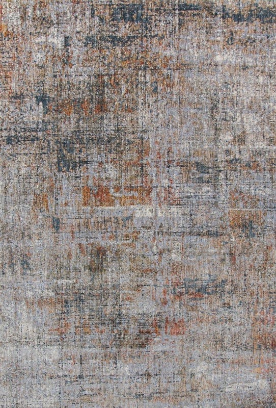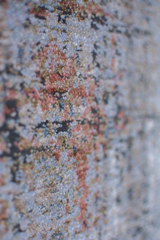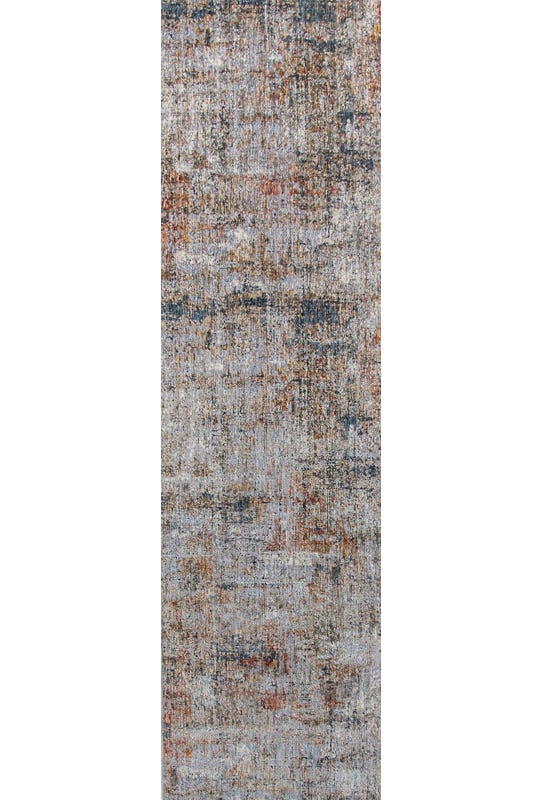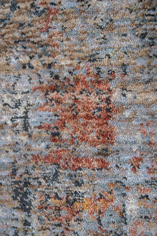 Alfombra Bazhars de origen turco, en base a poliester y shrink poliester. Su textura es contundente logrando un exquisito tramado, suave y resistente. Su moderno diseño abstracto combina tonos gris claro con sutiles toques de terracota y azul. Tiene excelentes terminaciones y orillado por el perímetro.