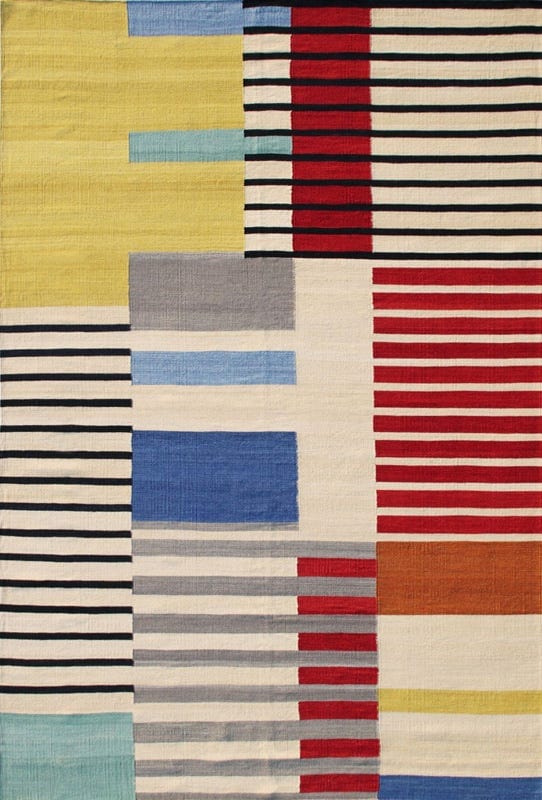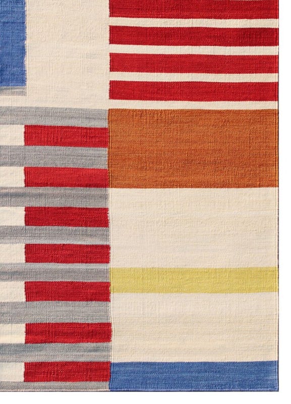 Alfombra Kelim Bazhars artesanal, confeccionada a mano por artesanos con lana natural de oveja. Tienen un diseño moderno en base a vivos colores, logrando una alfombra que realza los ambientes.