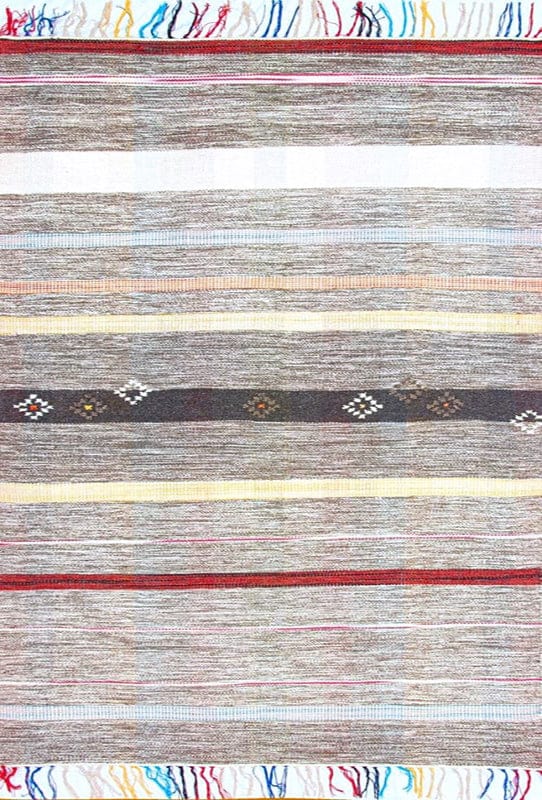 Alfombra Kelim Bazhars artesanal, confeccionada a mano por artesanos con lana natural de oveja. Sobre una base Café/Beige, tienen detalles de diseño en vivos colores, logrando una alfombra que realza los ambientes. Reversible, y para diferentes espacios.