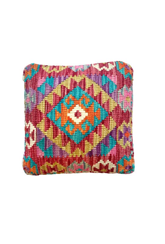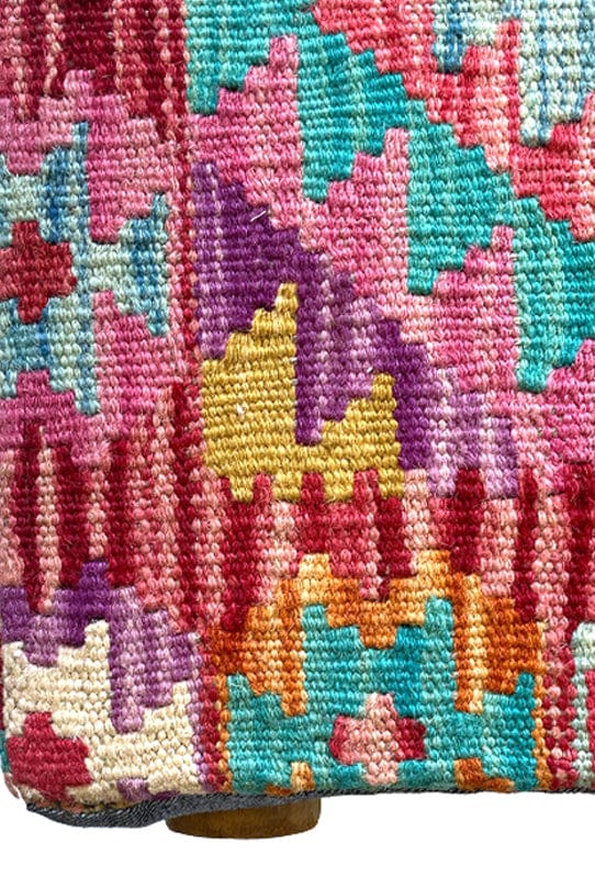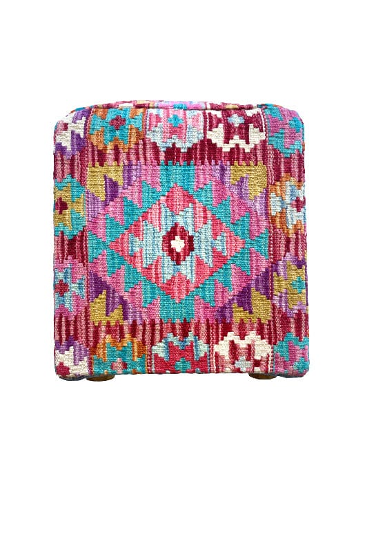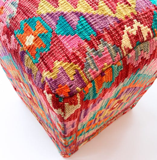 Pouf Kelim Vegi único, tejido a mano en telares por artesanos afganos, con diseños étnicos y vivos colores usando lanas hiladas artesanalmente y teñidas con tintas naturales, manteniendo una tradición transmitida de generación en generación.