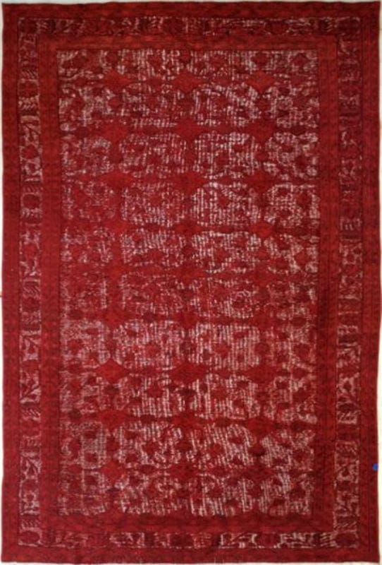 Alfombra hecha en base a una combinación de trozos de distintas alfombras anudadas a mano, modernizadas con tratamientos de teñido y carving, combinadas y cosidas por artesanos.