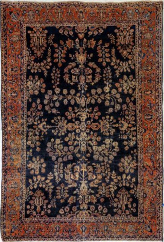Alfombra de no menos de 80 años de antiguedad, anudada a mano por artesanos en tiempos en que la elaboración no estaba industrializada y por ende todo el proceso de hilado, teñido y anudado se hacía en forma 100% artersanal.