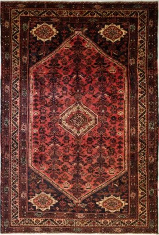 Alfombra anudada a mano por artesanos de tribus nómades,con dibujos simples y geométricos, trazados lineales y colores vivos. El motivo principal suele ser un rombo, solo o repetido tres veces.
