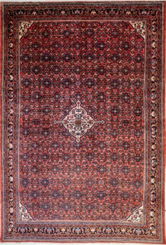Alfombra anudada a mano por artesanos iraníes, a veces con medallón central o bien con motivos repetitivos, siendo el "HERAT" o flores encerradas en un rombo el más frecuente. Los colores usados suelen ser azul añil o rojo vivo.