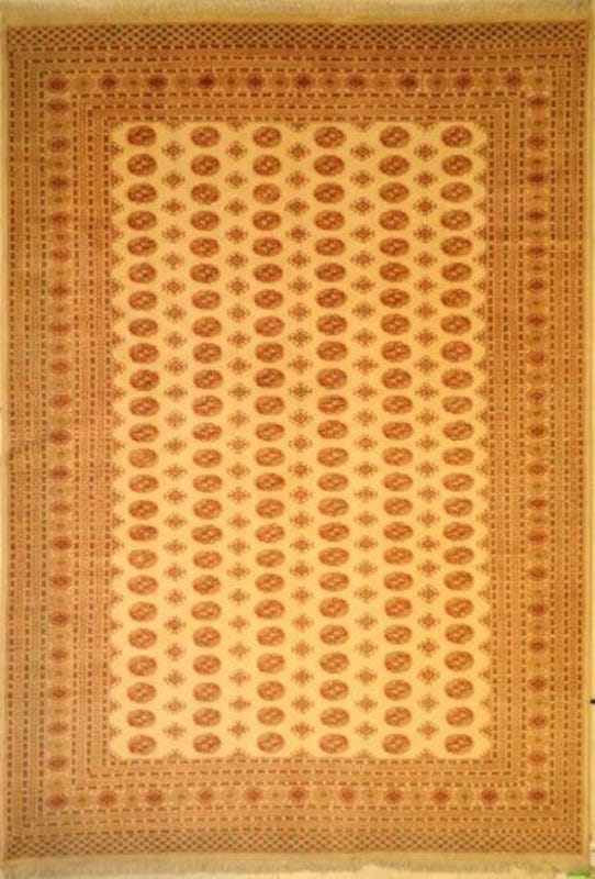 Alfombra anudada a mano por artesanos pakistaníes, con diseño de estilo clásico en base a figuras geométricas con predominio de tonos beige, café y burdeos.