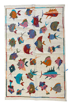 Alfombra Kelim Bazhars artesanal, tejida y bordada a mano por artesanos con lana natural de oveja. Sobre una base color crudo se bordan distintas figuras de animales y naturaleza, siendo cada ejemplar único e irrepetible.