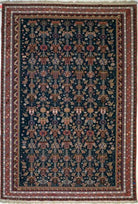 Alfombra tejida y bordada a mano en telares por artesanos, con diseños sofisticados, un gran campo central sin medallón y un fino patrón de tejido y bordado.