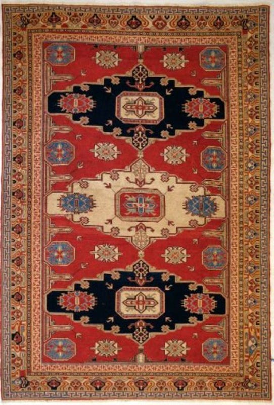 Alfombra tejida y bordada a mano en telares por artesanos, con diseños sofisticados, un gran campo central sin medallón y un fino patrón de tejido y bordado.