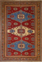 Alfombra tejida y bordada a mano por artesanos en telares, con diseños geométricos de estilo clásico y predominancia de tonos azules y rojos. Se originaron en el área de Kazak (Armenia), a principios del siglo XVIII.