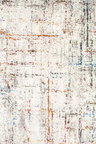 Alfombra Bazhars industrial, confeccionada en polyester. Su diseño abstracto sobre fondo gris combina elegantes tonos azules y beige, logrando una alfombra con ricas texturas y gran calidez.