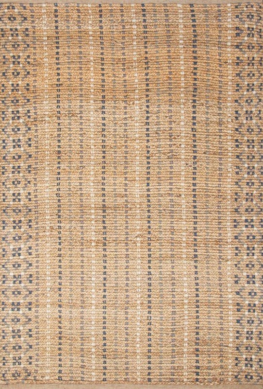 Alfombra Bazhars artesanal, tejida a mano por artesanos con finas hebras de jute y finos diseños de franjas en color crudo con sutiles toques de azul, celeste y blanco. Excelentes terminaciones con backing anti deslizante por debajo.