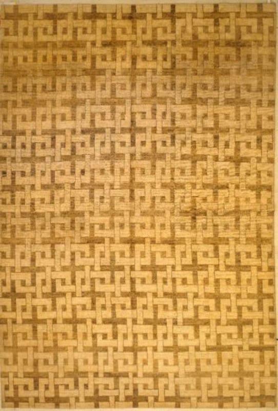 Alfombra anudada a mano por artesanos nepaleses, con diseños de estilo moderno y estilizado, con predominancia de tonos tierra, beige, café, terracota y grises.
