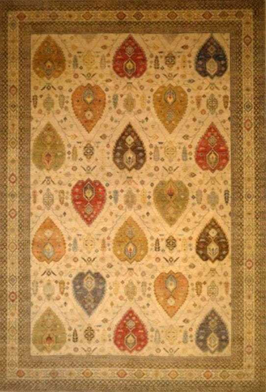 Alfombra anudada a mano por artesanos, con motivos curvilíneos y florales, con una tradición que se remonta al siglo XI.