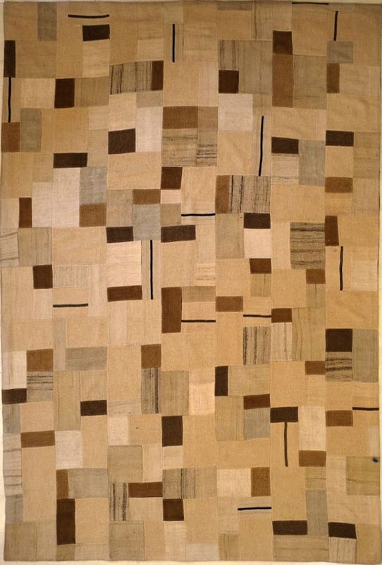 Alfombra hecha en base a una combinación de trozos de distintas alfombras anudadas a mano, predominando los tonos café y beige, combinadas y cosidas por artesanos.