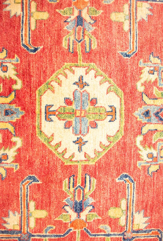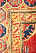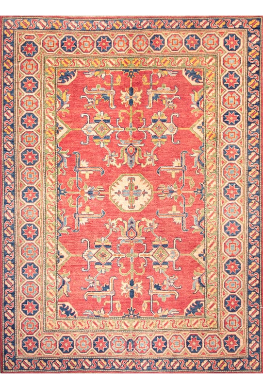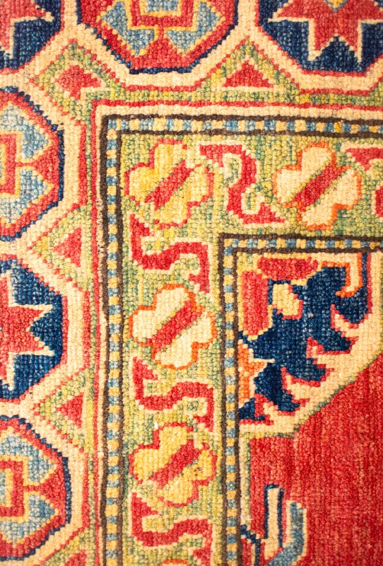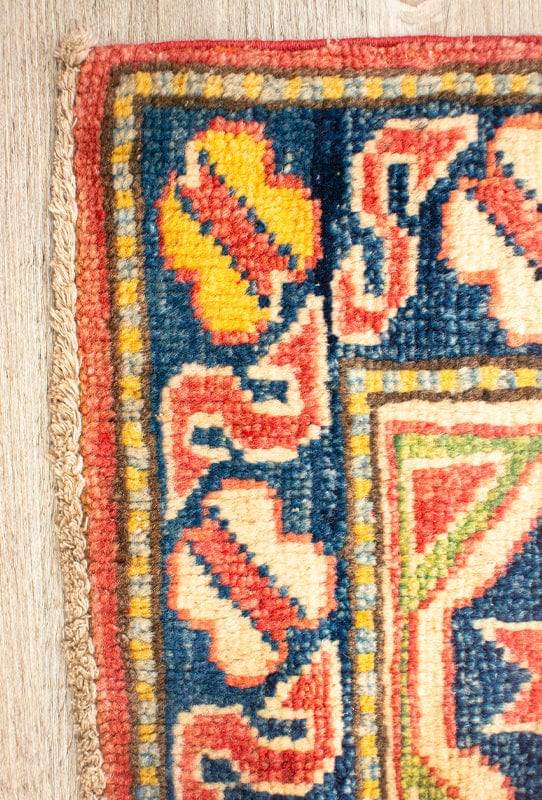 Alfombra anudada a mano por artesanos, diseños geométricos de estilo clásico y predominancia de tonos azules y rojos. Se originaron en el área de Kazak (Armenia) a principios del siglo XVIII.