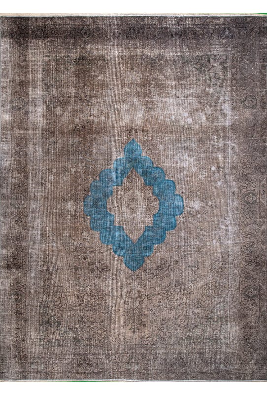 Alfombra anudada a mano por artesanos, reciclada y modernizada a través de tratamientos de teñido y carving, logrando un diseño clásico con colores y texturas modernas.