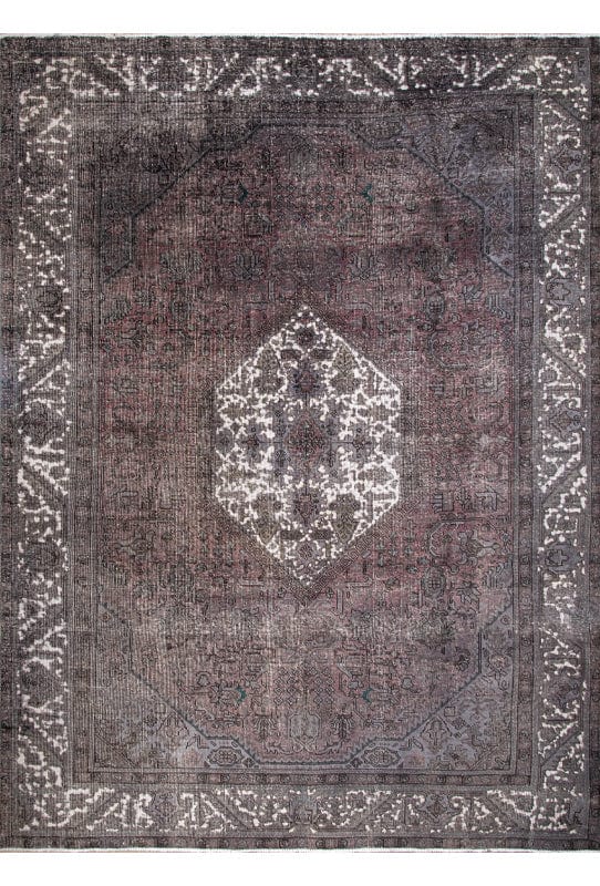 Alfombra anudada a mano por artesanos, reciclada y modernizada a través de tratamientos de teñido y carving, logrando un diseño clásico con colores y texturas modernas.