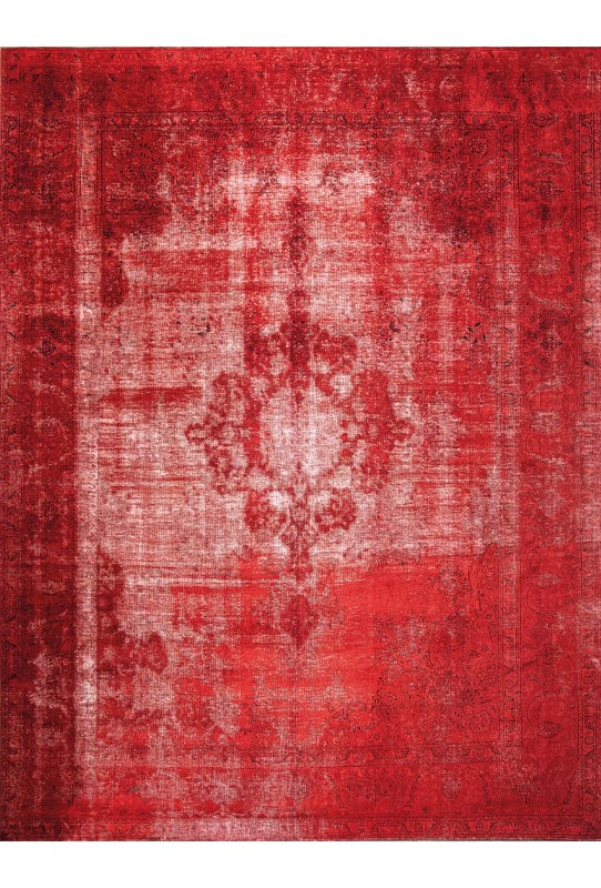 Alfombra anudada a mano por artesanos, reciclada y modernizada a través de tratamientos de teñido y carving, logrando un diseño clásico con colores y texturas modernas.