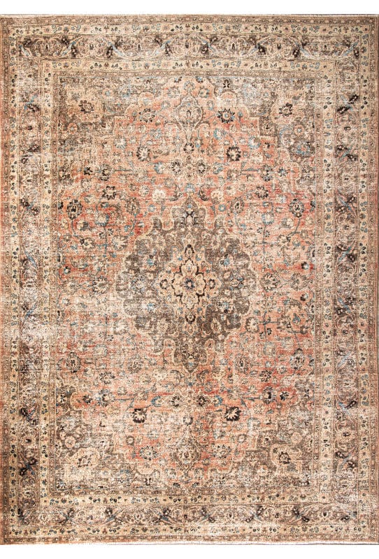 Alfombra anudada a mano por artesanos, reciclada y modernizada a través de tratamientos de teñido y carving, logrando un diseño clásico con colores y texturas modernas.