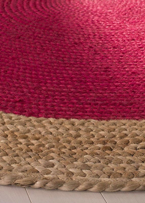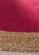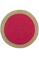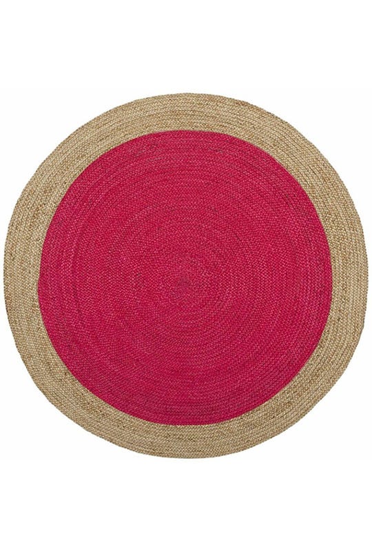 Alfombra Bazhars redonda artesanal, tejida a mano por artesanos con finas hebras de jute, logrando un trama densa, muy práctica y resistente. Excelente terminaciones y un centro de color fuccia