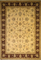 Alfombra anudada a mano por artesanos, con diseños florales, estilo clásico y predominancia de tonos beige claro, café y burdeos. El término "Ziegler" proviene de una distribuidora de alfombras anglo suiza que funcionaba en el siglo XIX