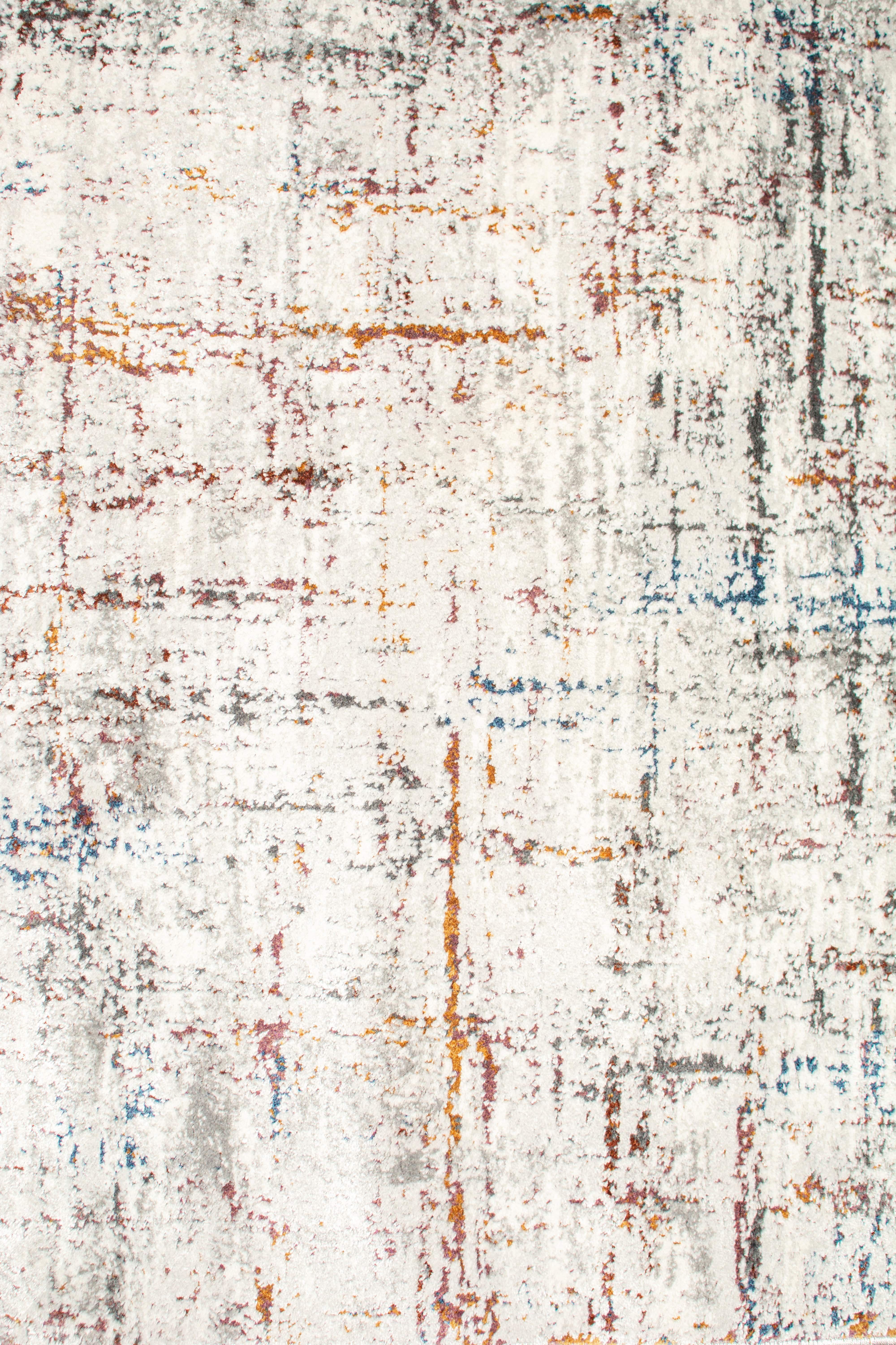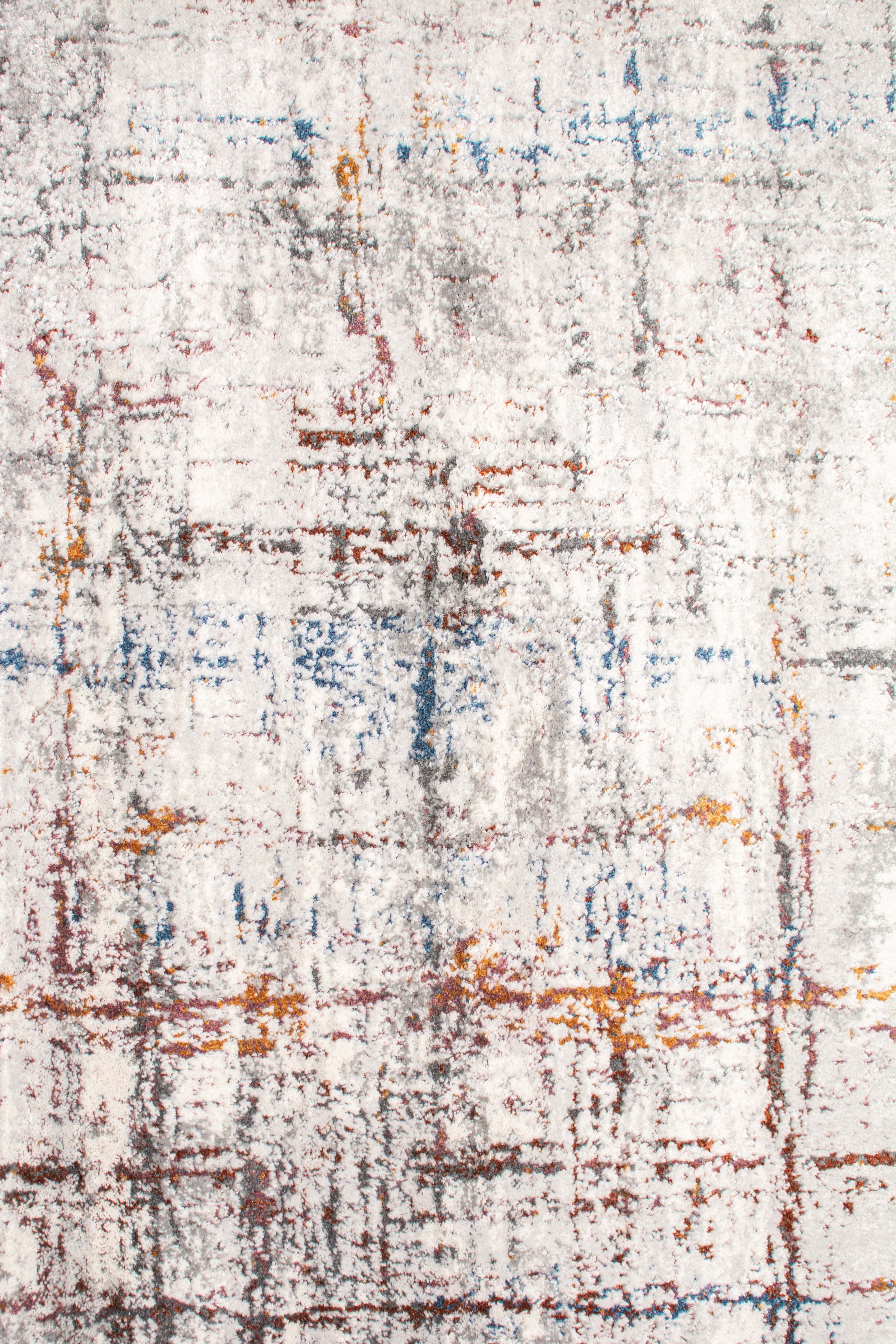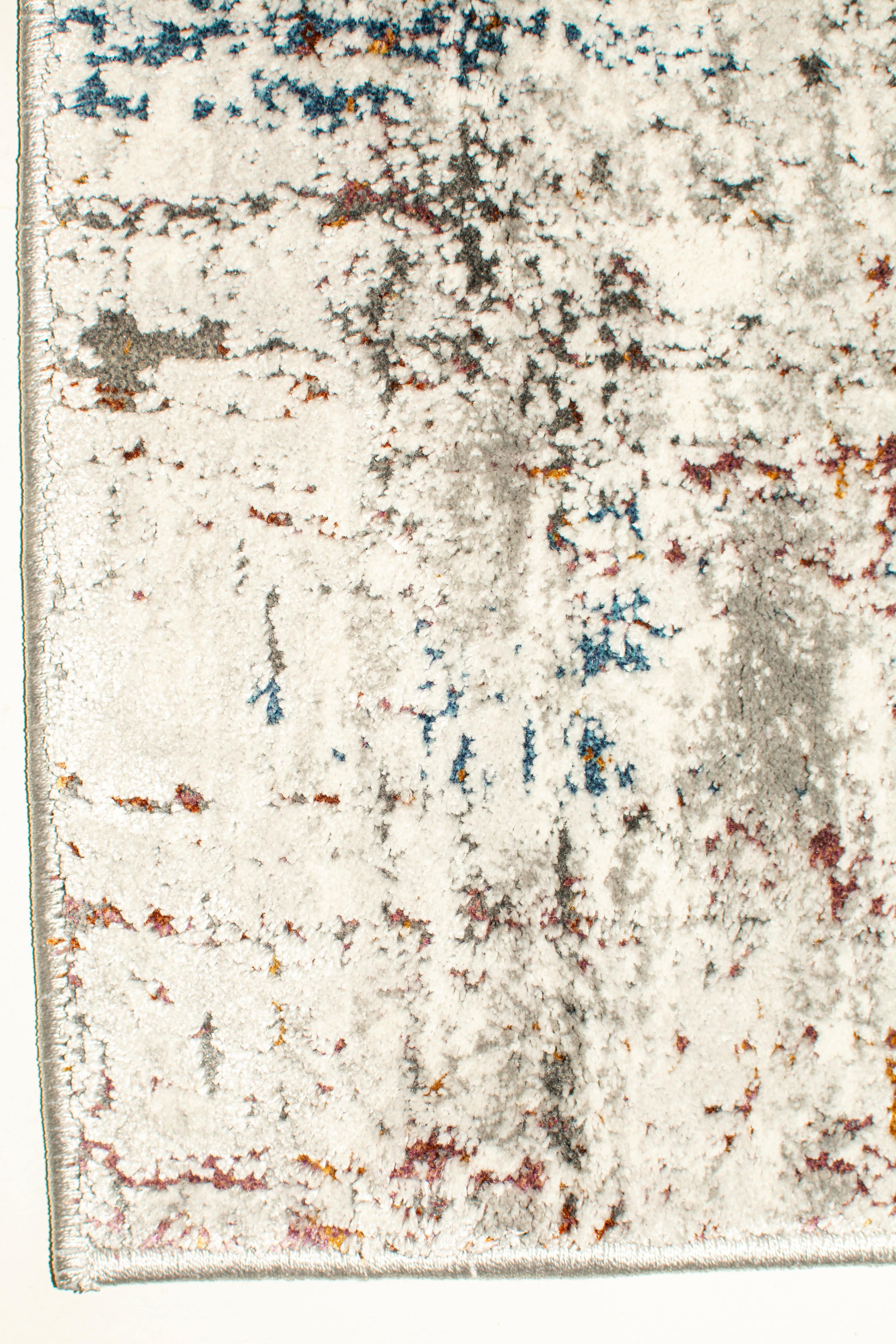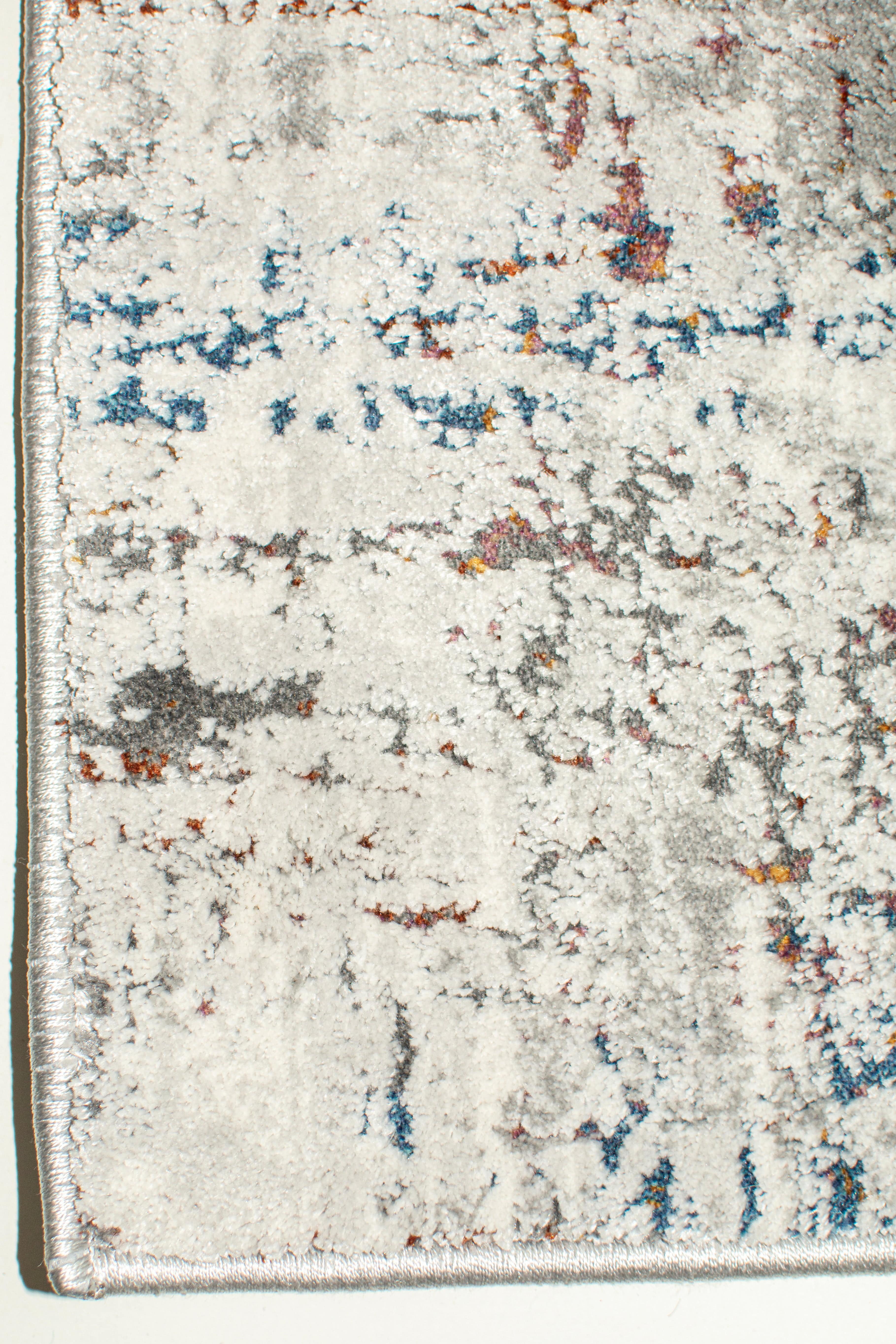 Alfombra Bazhars industrial, confeccionada en polyester. Su diseño abstracto sobre fondo gris combina elegantes tonos azules y beige, logrando una alfombra con ricas texturas y gran calidez.