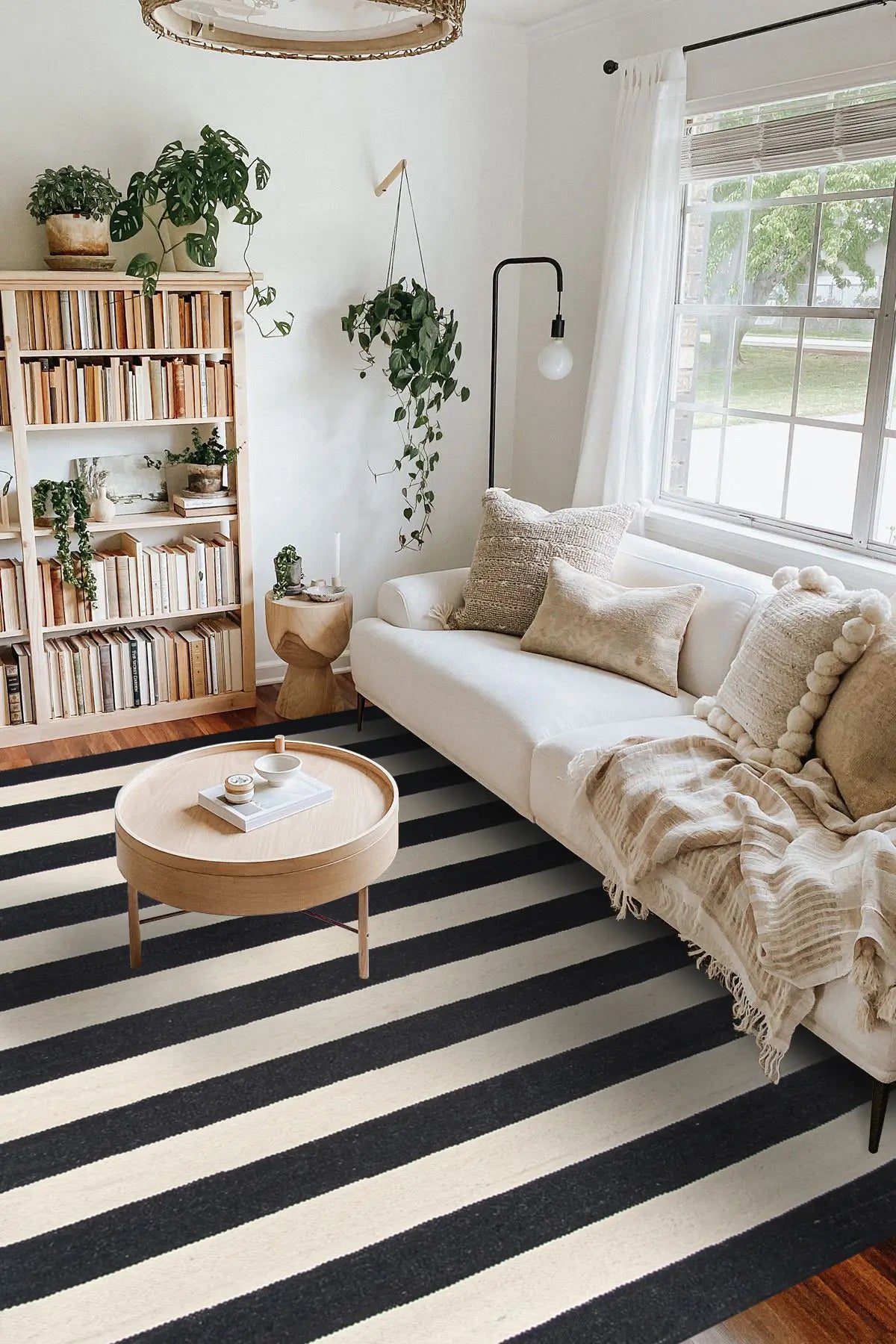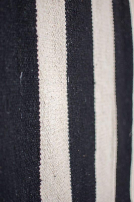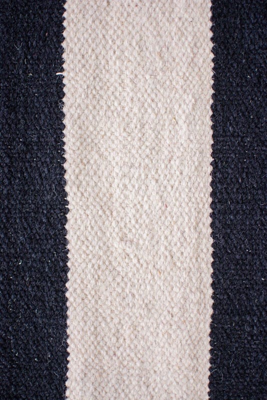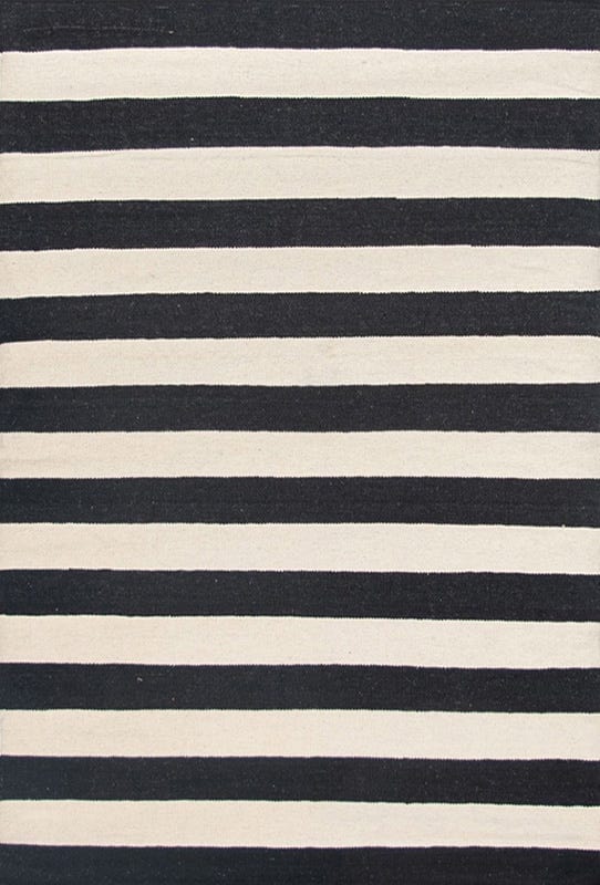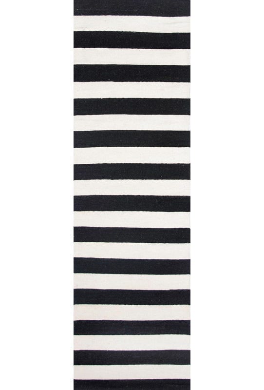 Alfombra kelim tejida a mano en India, con técnica de tejido plano. Destaca por su sencillo diseño en colores natural y negro, ideal para añadir un toque artesanal y elegante a cualquier espacio.