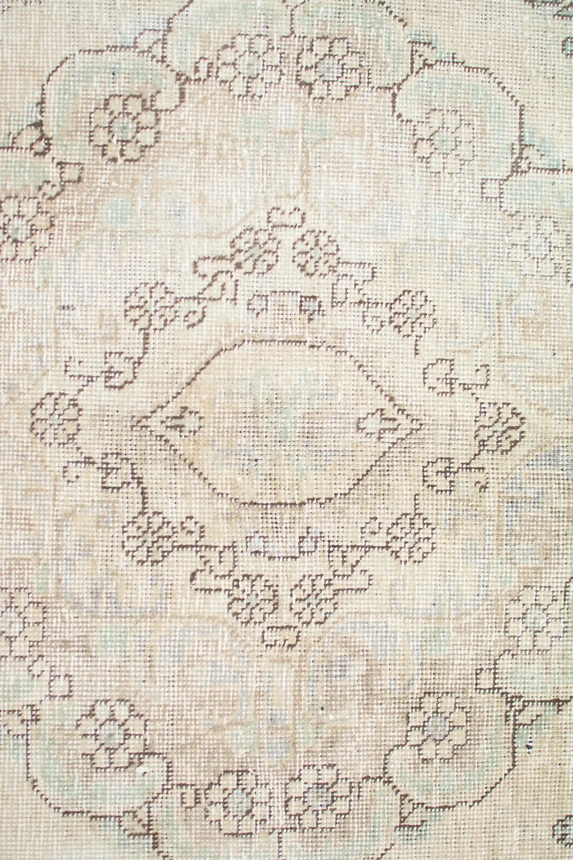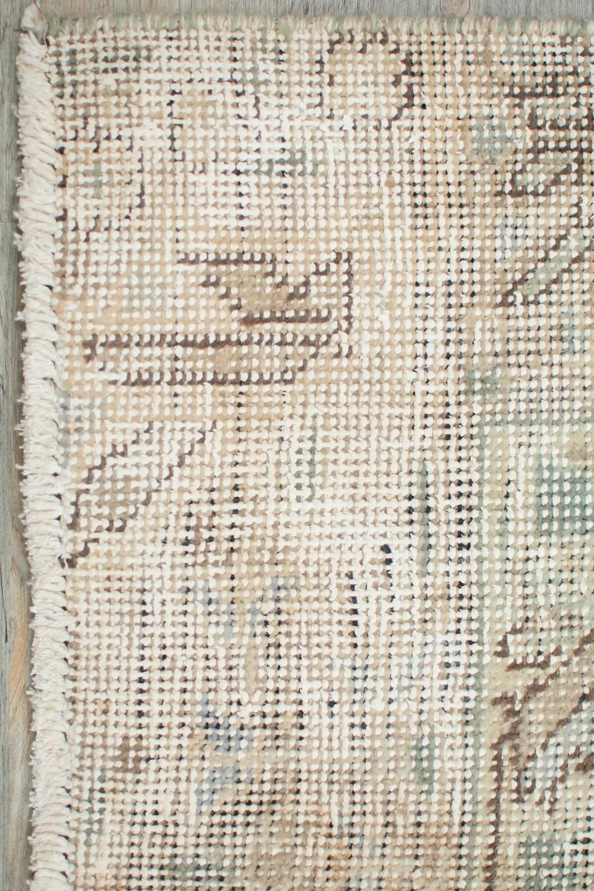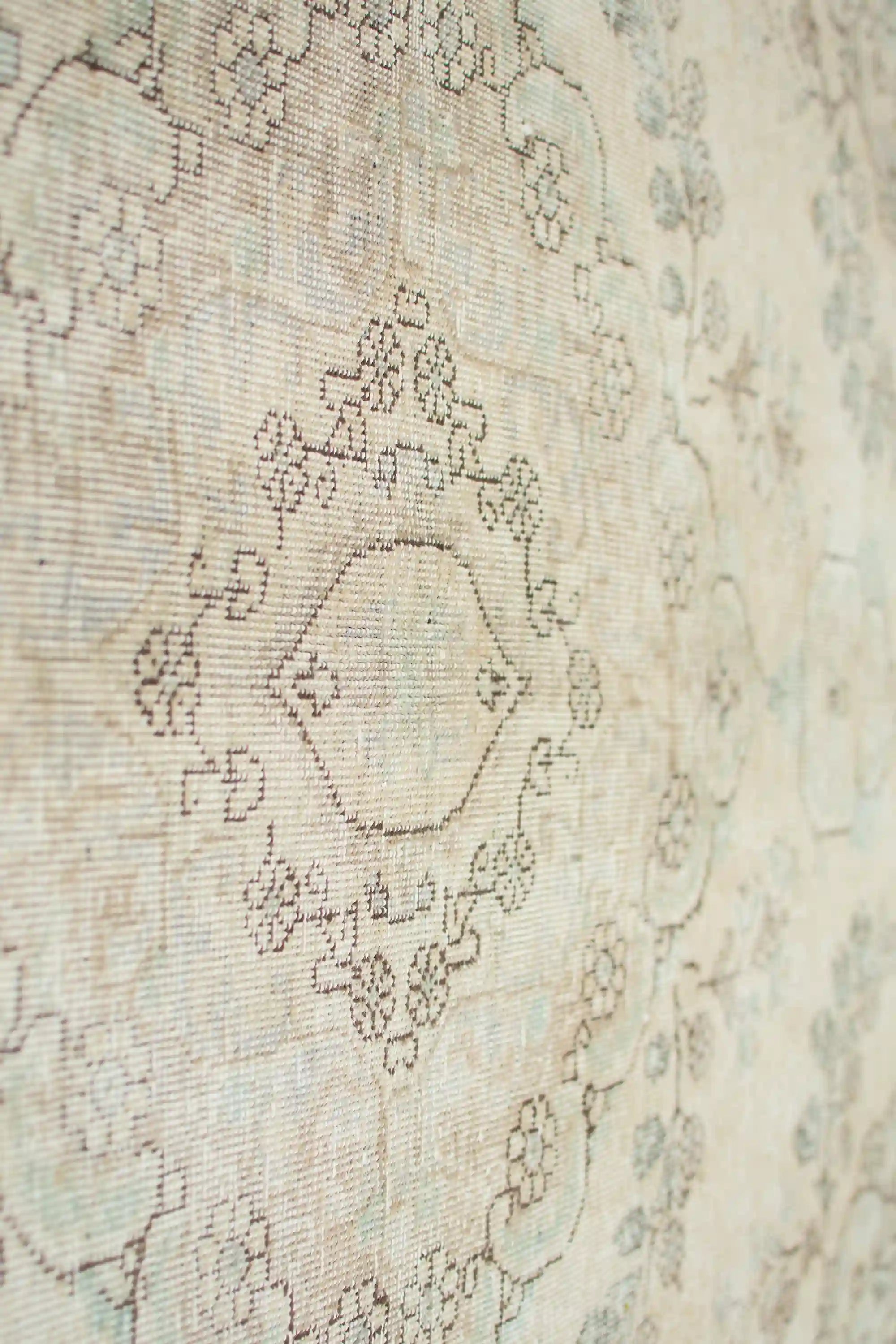 Alfombra anudada a mano por artesanos, reciclada y modernizada a través de tratamientos de teñido y carving, logrando un diseño clásico con colores y texturas modernas.
