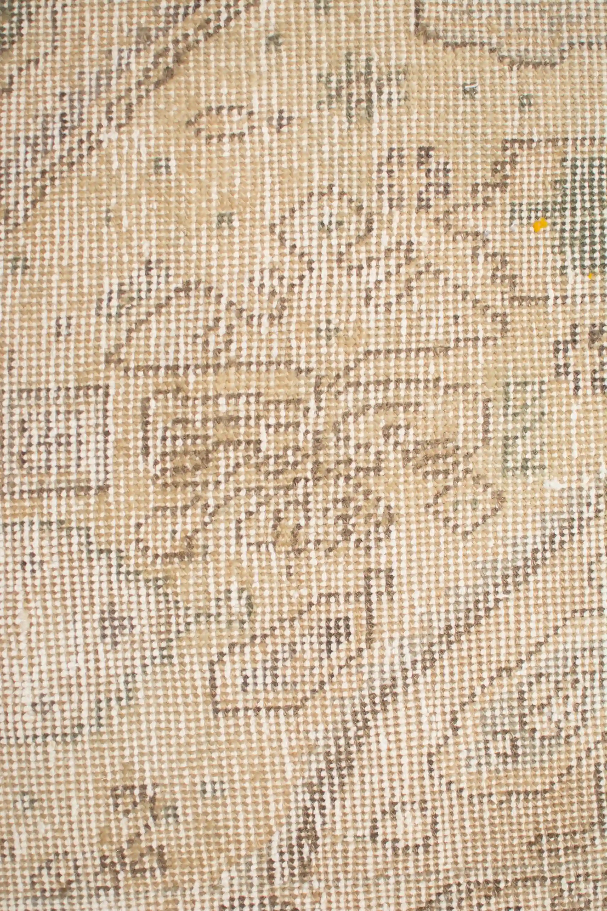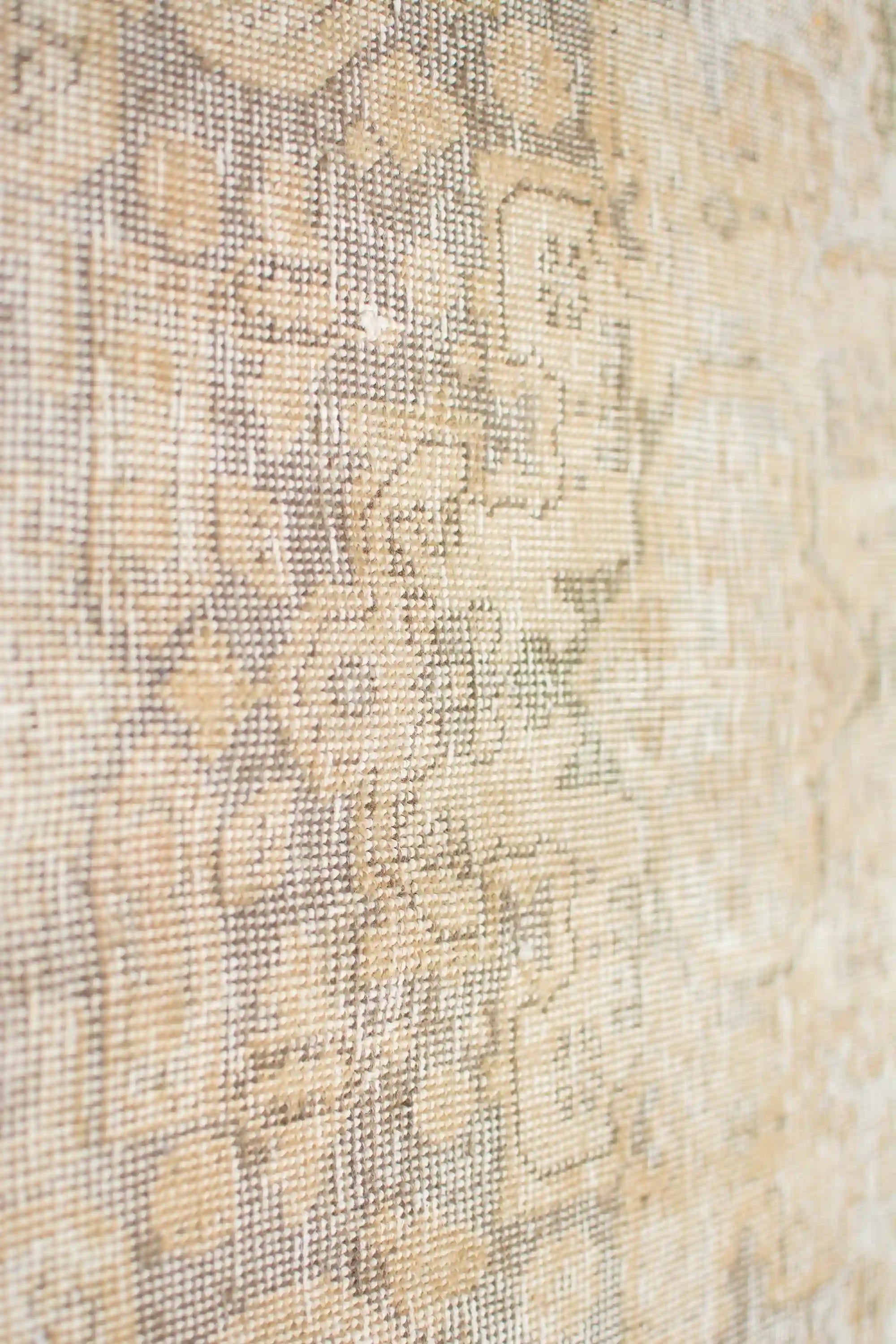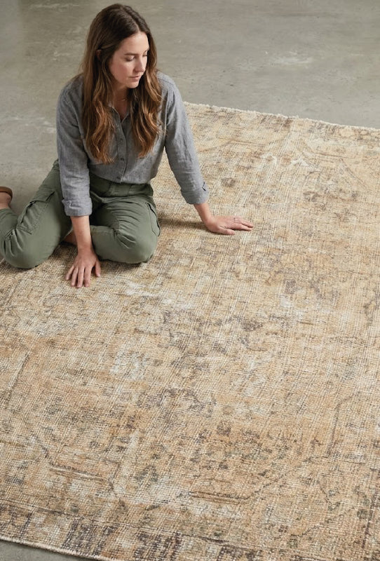 Alfombra anudada a mano por artesanos, reciclada y modernizada a través de tratamientos de teñido y carving, logrando un diseño clásico con colores y texturas modernas.