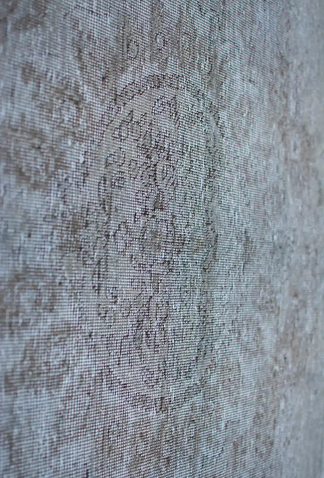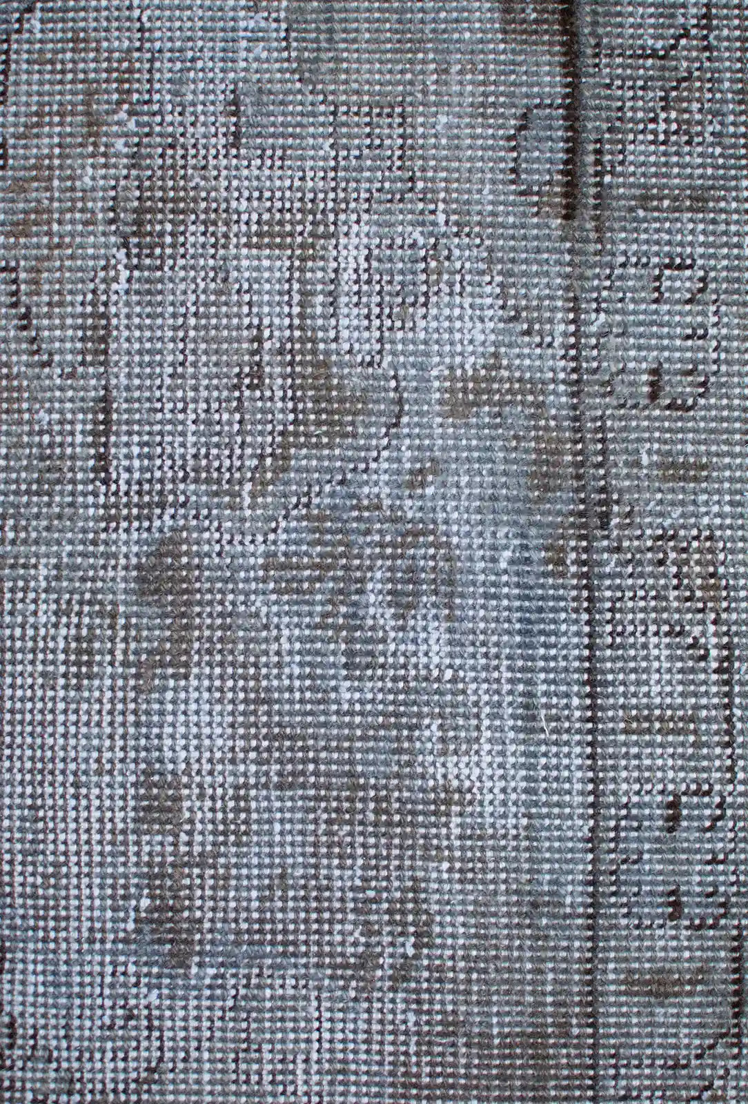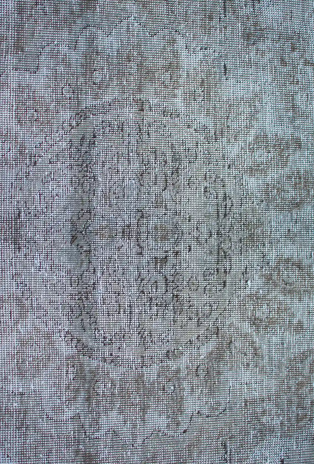 Alfombra anudada a mano por artesanos, reciclada y modernizada a través de tratamientos de teñido y carving, logrando un diseño clásico con colores y texturas modernas.